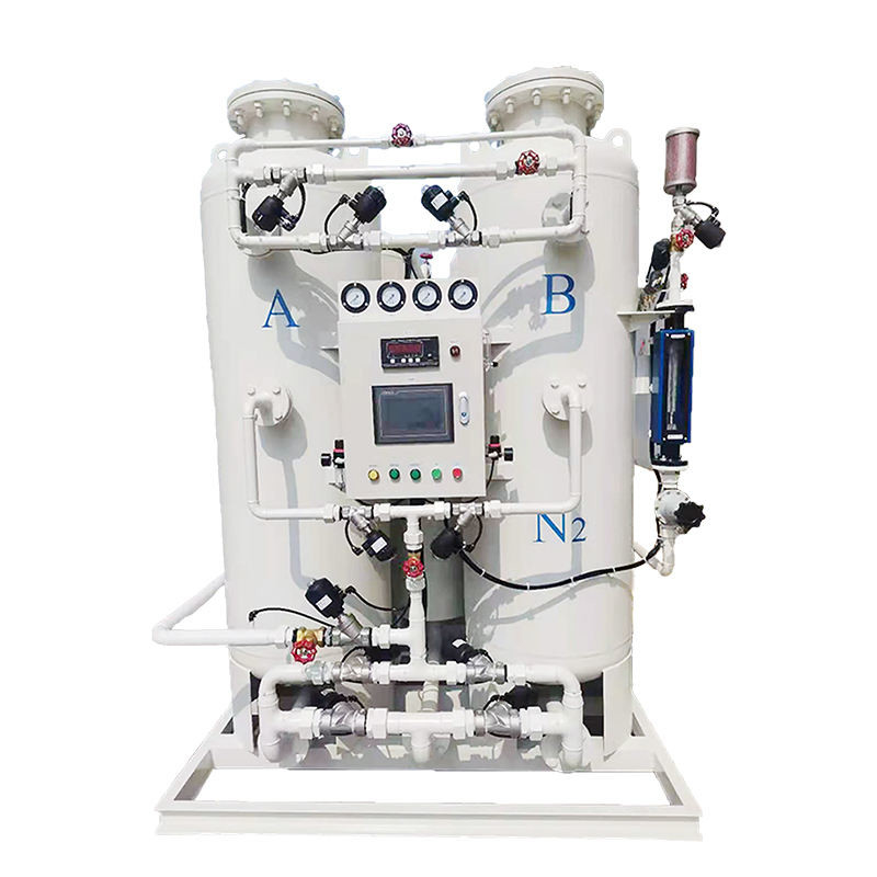 La parte principale del generatore di O2 è costituita da due torri riempite con setaccio molecolare, quando l'aria compressa entra nella torre di adsorbimento, l'N2 viene assorbito dal setaccio molecolare, l'N2 viene prodotto dal terminale di esportazione. Quando una torre produce N2, un'altra torre rilascia l'N2 riducendo la pressione per ottenere la desorbimento rinnovabile del setaccio molecolare di carbonio. Due torri alternano adsorbimento e rigenerazione per emettere N2 continuamente.